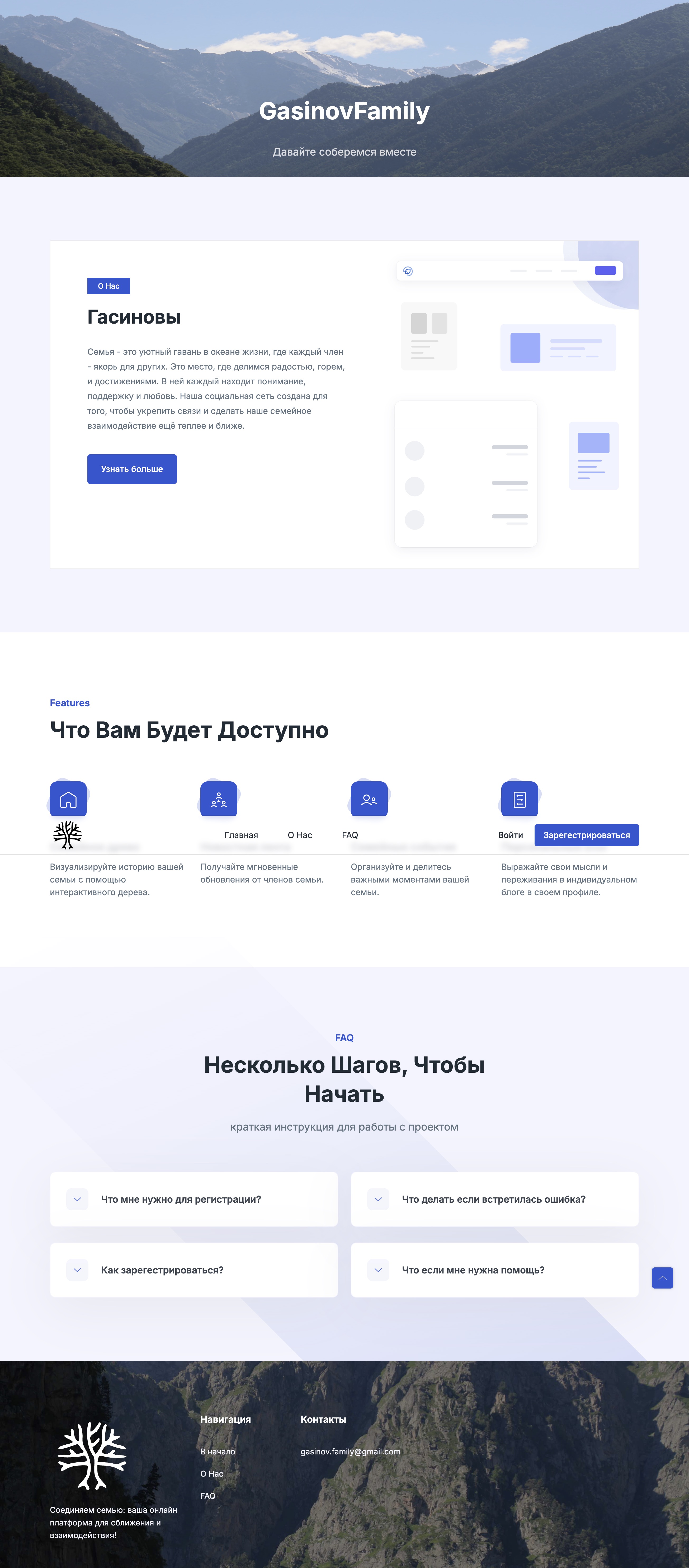 GasinovFamily — это уникальное веб-приложение, которое объединяет членов семьи в социальной сети, предлагая ленту постов, профили, интерактивное семейное древо и возможность планировать совместные события для поддержания семейных традиций.